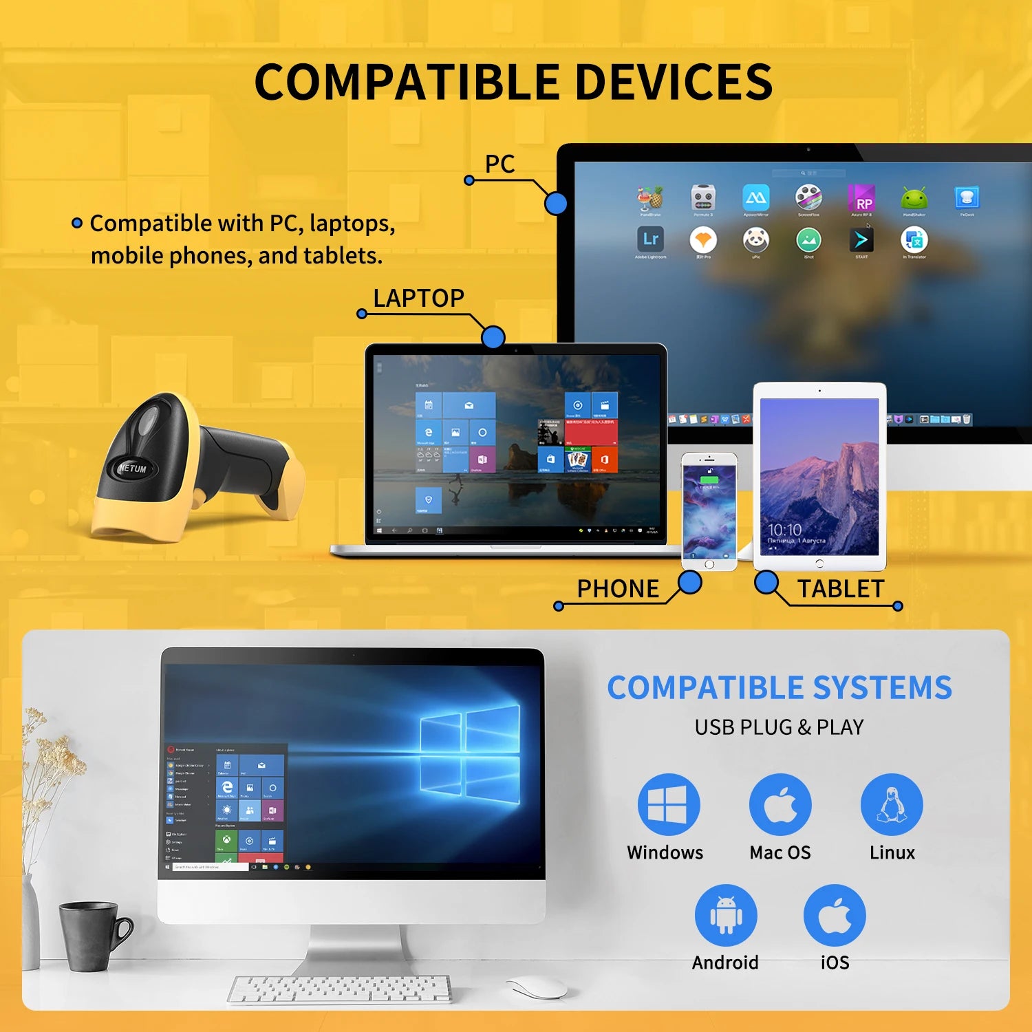 This NETUM 1d laser barcode scanner, can read most 1D barcodes like Code 11, Code 93, MSI, Code 128, UCC/EAN-128, Code 39, EAN-8, EAN-13, UPC-A, ISBN, Industrial 25, Interleaved 25, Standard 25, 2/5 Matrix. Resolution 5mil