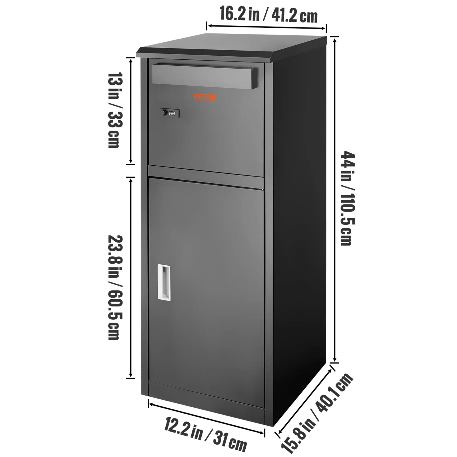 Product Size: 44 x 35 x 58.3cm / 17.3 x 13.8 x 22.8 in Delivery Slot Size: 35.5 x 22 x 53 cm / 14 x 8.7 x 20.8 in Max Package Storage Size: 35.5 x 11.5 x 19.2 cm / 14 x 4.5 x 7.6 in Lock Type: Coded Lock Material: 0.8mm Galvanized Steel Weight Capacity: 33-44lbs